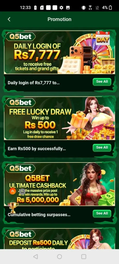 Q5 Bet provides bonuses in terms of daily logins and small-scale encouragement to make users play the additional rounds without investing in the game anymore.